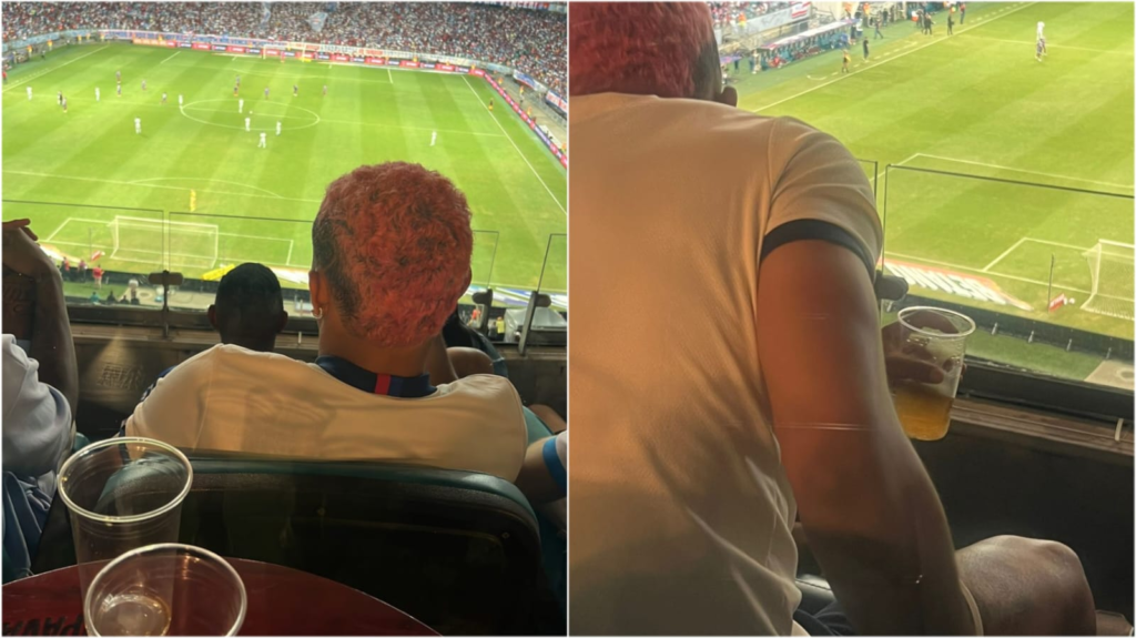 Neste sábado (21), o atleta foi clicado por um torcedor durante a partida entre Bahia e Fortaleza, válida pela 28ª rodada do Campeonato Brasileiro. Na imagem, enviada ao BNews, Jacaré está na arquibancada, assistindo ao jogo com uma bebida na mão.