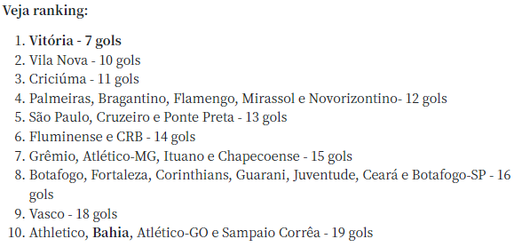 Nesta estatístia, o Esporte Clube Bahia aparece como 12ª melhor defesa em jogos dentro de casa, com 19 gols sofridos em 17 partidas, empatado com o Athletico.