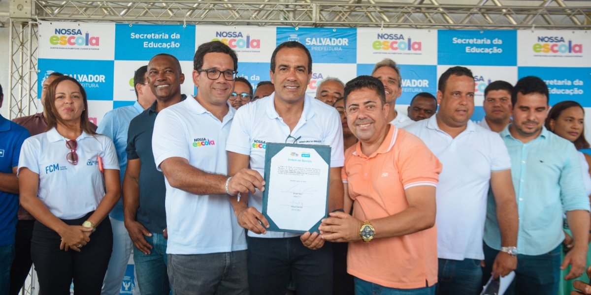 A Prefeitura de Salvador vai construir uma nova escola no Bairro da Paz, que contará com piscina semiolímpica, 28 salas de aula climatizadas com kit multimídia e capacidade para atender 1.960 alunos, sendo 980 por turno. O prefeito Bruno Reis esteve na manhã desta segunda-feira (15) na localidade para assinar a ordem de serviço da obra, que dará origem a uma das maiores estruturas dentro do pacote de 50 unidades de ensino que serão inauguradas pela gestão municipal até o final deste ano.