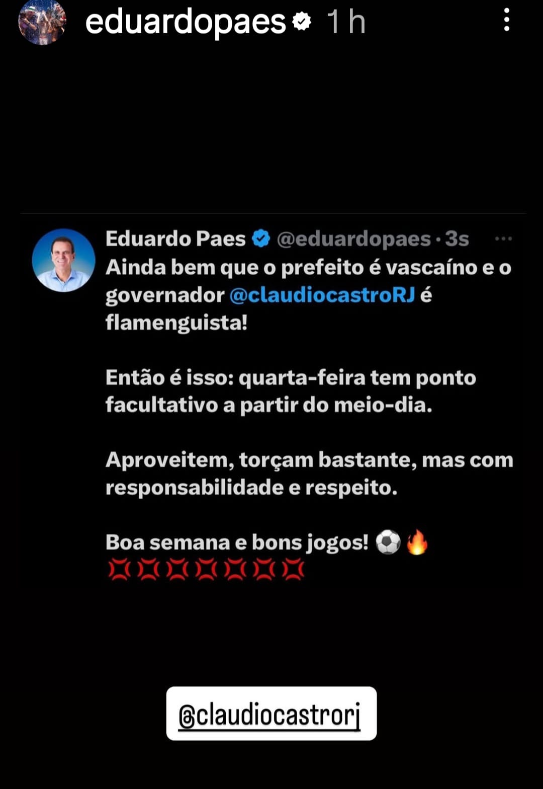 – Ainda bem que o prefeito é vascaíno e o governador@claudiocastroRJ é flamenguista! Então é isso: quarta-feira tem ponto facultativo a partir do meio-dia. Aproveitem, torçam bastante, mas com responsabilidade e respeito. Boa semana e bons jogos – publicou Eduardo Paes, para a alegria de torcedores do Flamengo e Vasco.